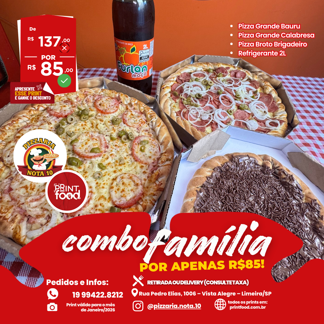 NOTA 10 - Combo Familia - 2 Pizzas + Brotinho + Refri Furlan 2L