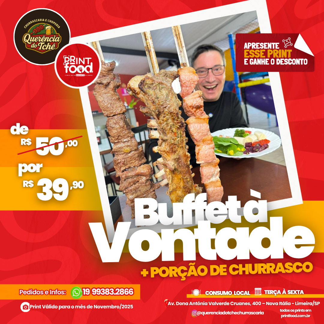 CHURRASCO À VONTADE - Churrasco + Buffet livre + sobremesa à vontade