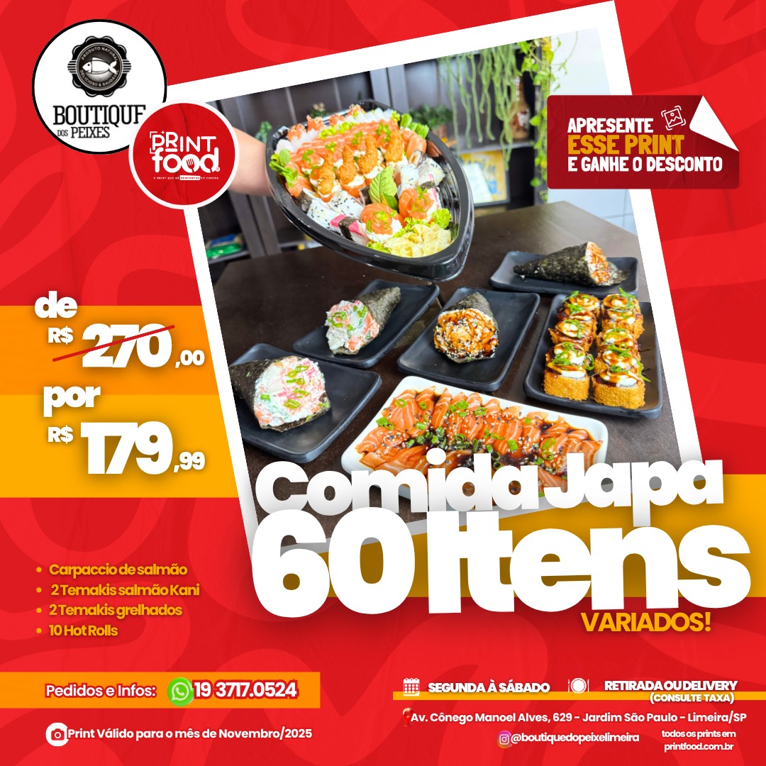 BARCA ESPECIAL - Barca especial 60 itens + 2 temakis Salmão com Kani + 2 temakis grelhados + 10 Hot Rolls + Carpaccio de Salmão