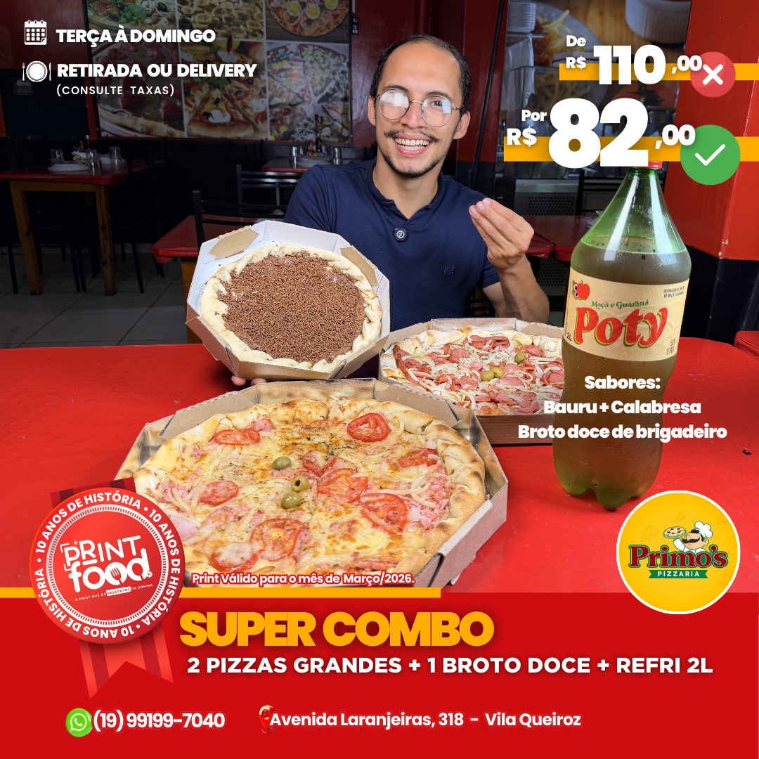 NOTA 10 - Combo Familia - 2 Pizzas + Brotinho + Refri Furlan 2L