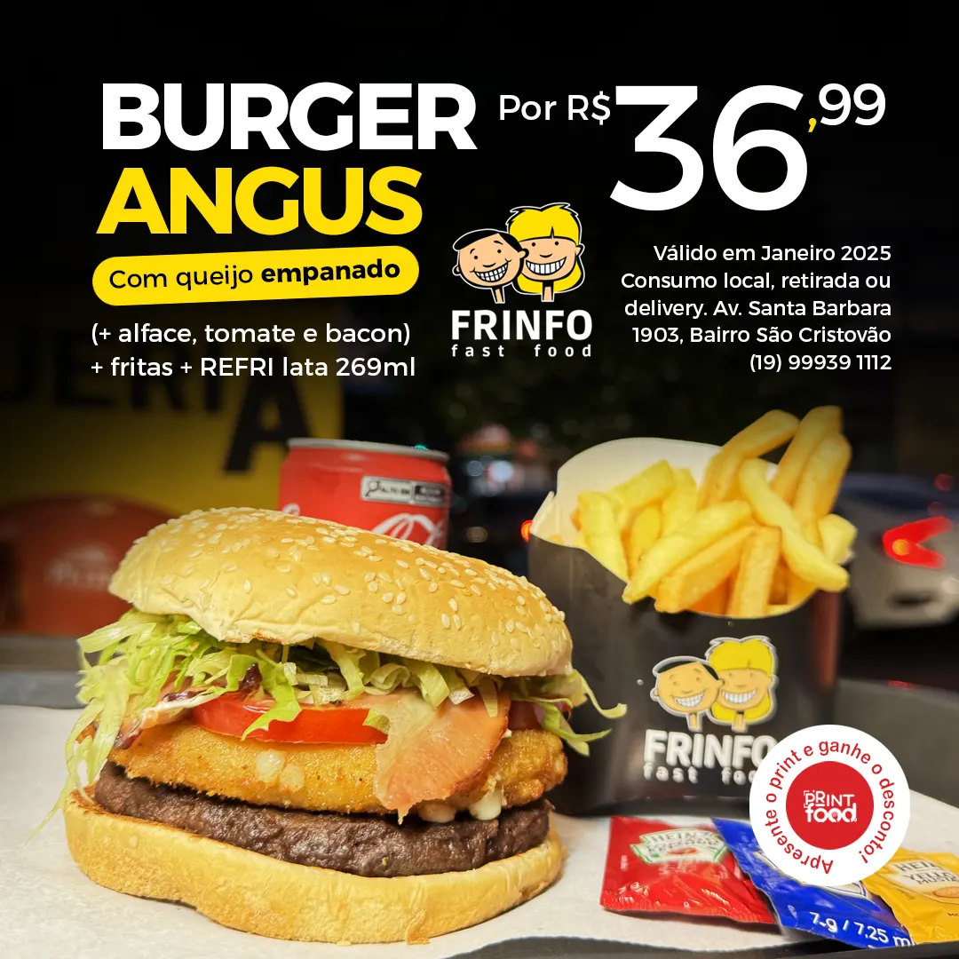 BURGER ANGUS FRINFO - Burger Angus com queijo empanado + fritas + refri lata 269ml